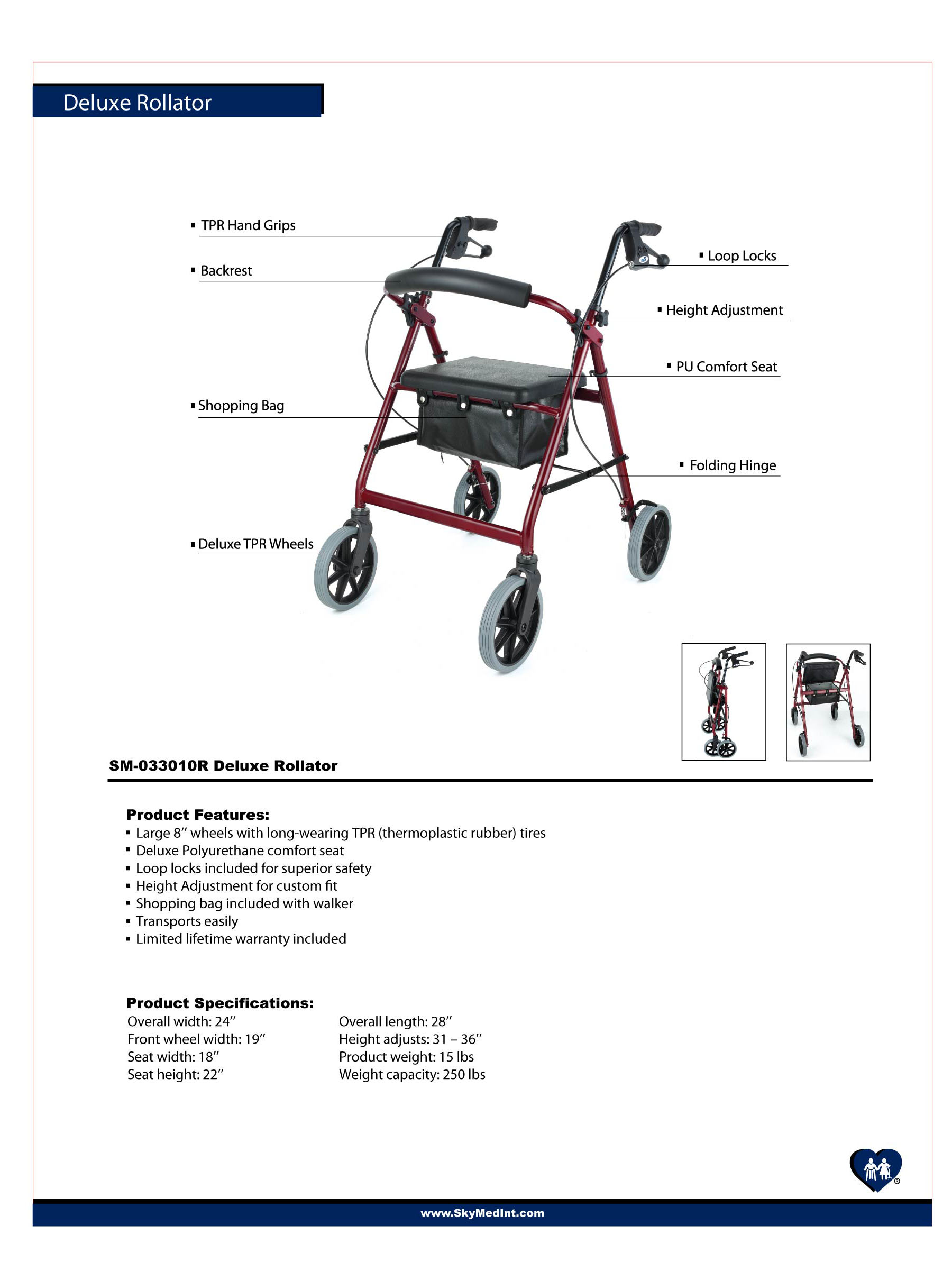 The Sky Med Deluxe Rollator features a sturdy, lightweight aluminum frame weighing in at only 15 pounds! The Rollator comes with a deluxe polyurethane comfort seat, and includes a shopping bag for stowing personal items, medications. Perfect for shopping trips and outings! Easily folded for transport, this chair features our new wider rear frame design, a loop lock braking system for added safety, and includes large 8”PVC tires. You'll love the quality, ease and convenience the Deluxe Rollator offers!